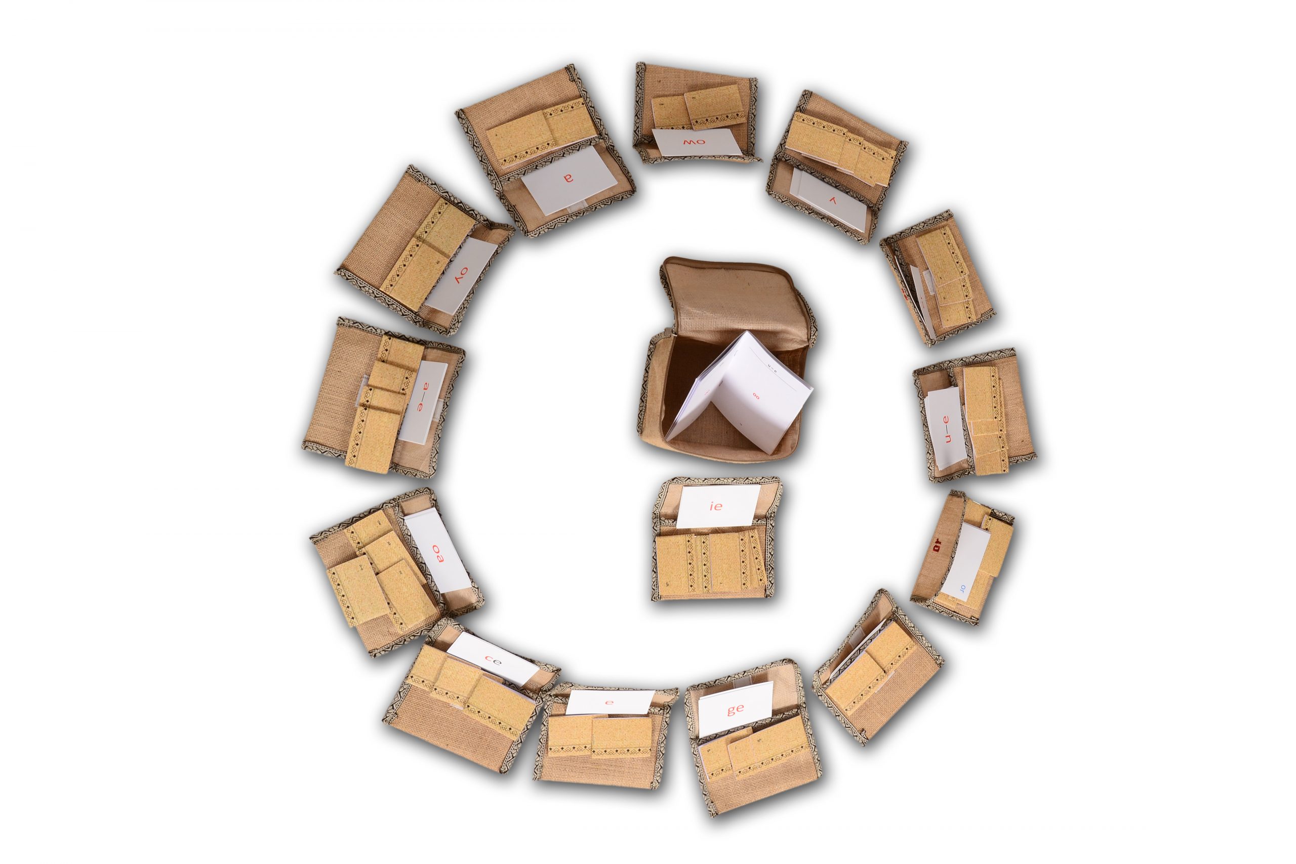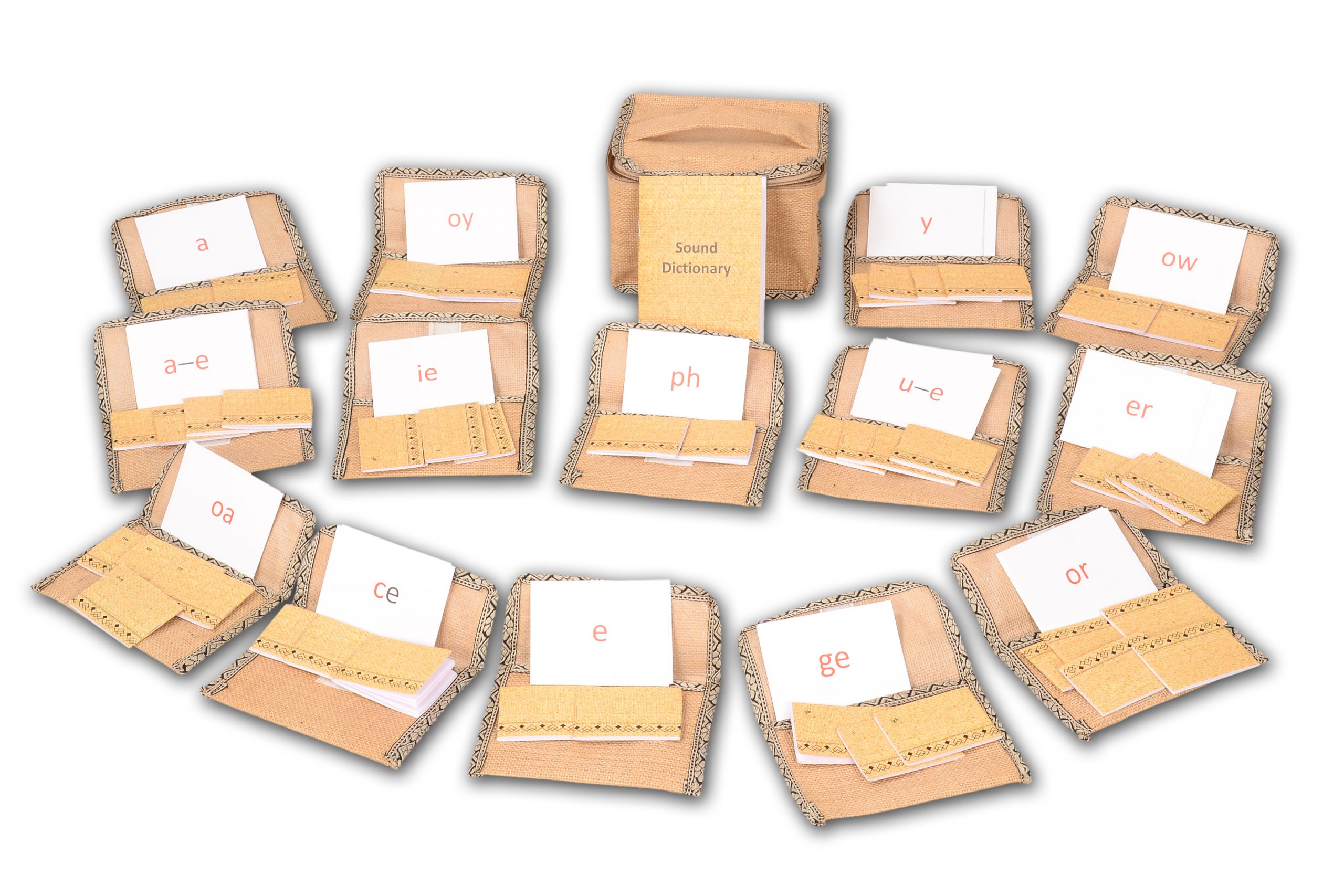 The Reading Folders Set from the IMF is made out of durable quality jute. It comes in a bag that includes 14 folders with each key sound (ai, ee, ie, oa, oo, oi, ow, er, or, s, f, e, j) printed on top and respective booklets in each of the folders to represent the key sound. Also included in the set is a Sound Dictionary.